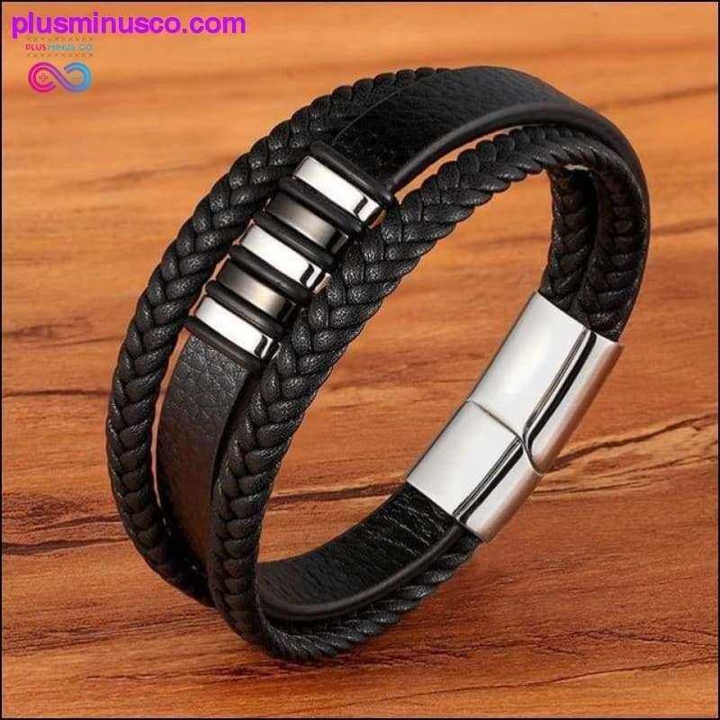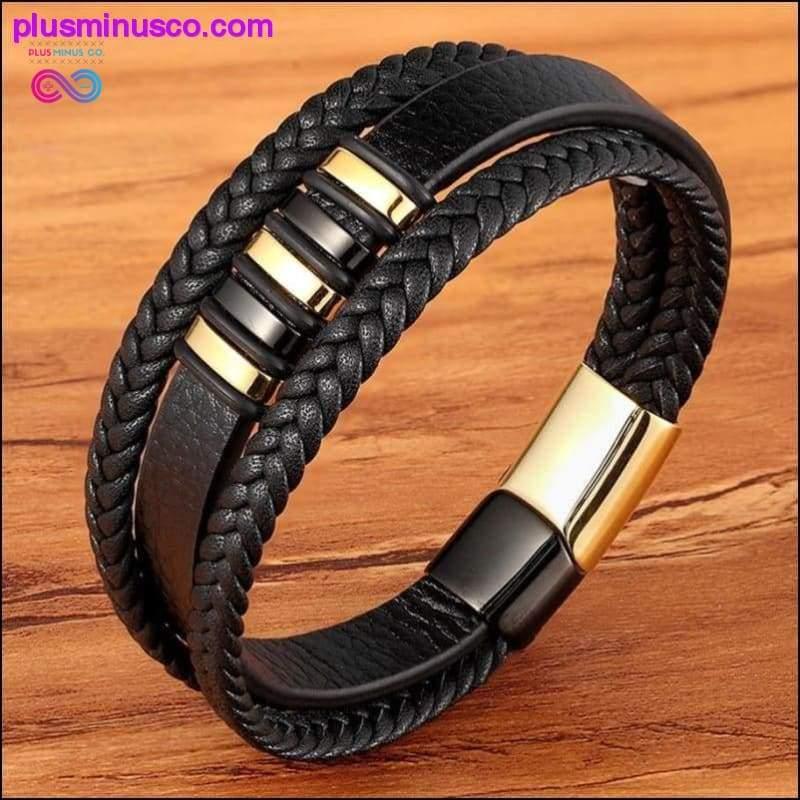 3 Layers Black Gold Punk Style Design Genuine Leather Bracelet with Steel Magnetic Button