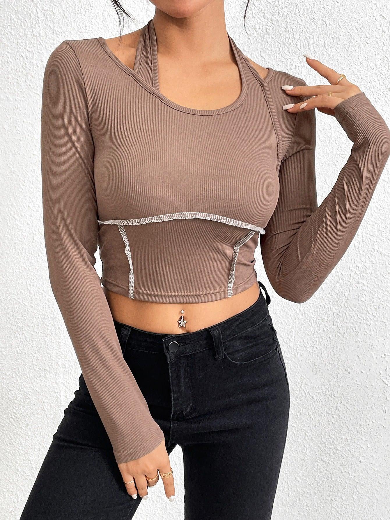 Slim fit knitted long sleeved sewing thread exposed hanging neck T-shirt fashion top