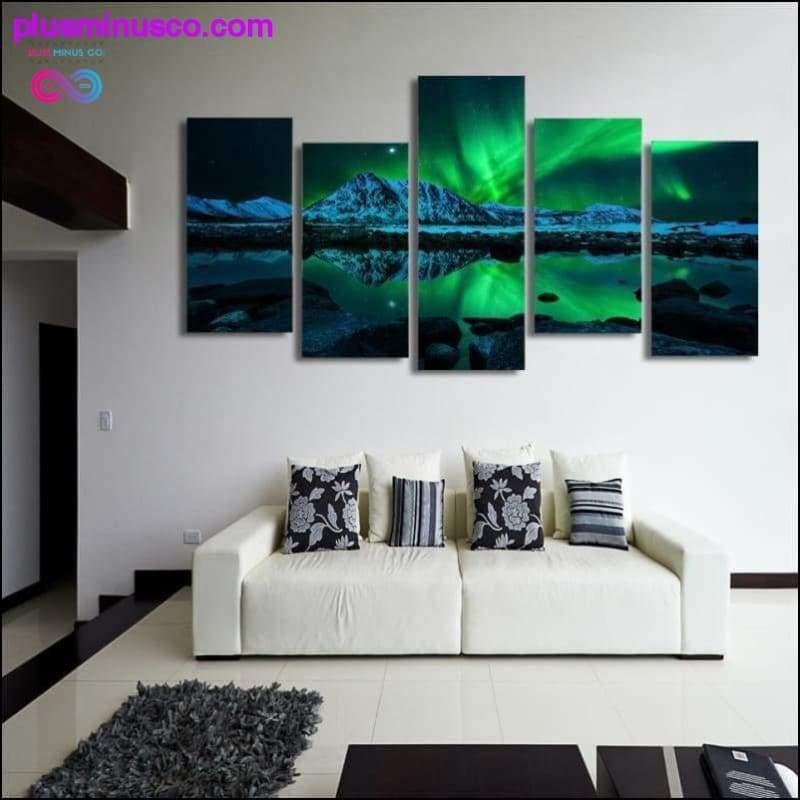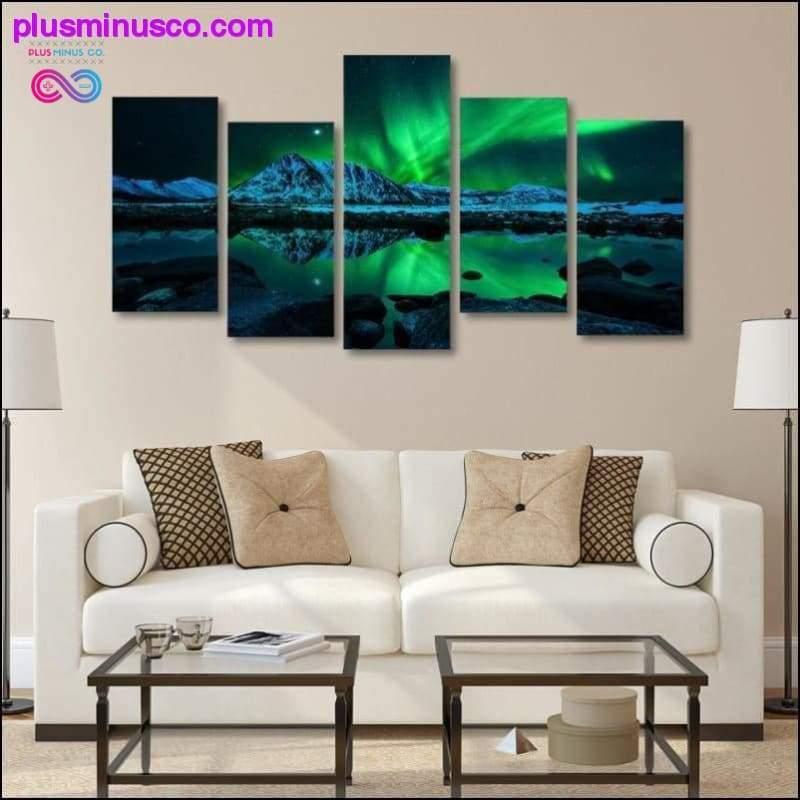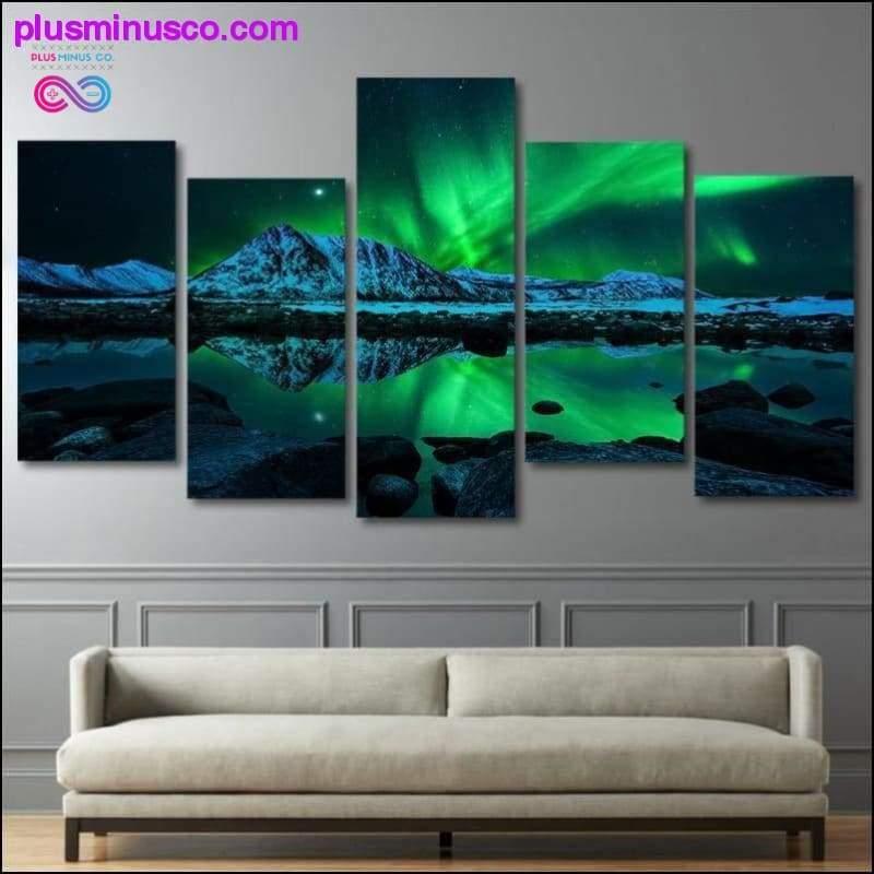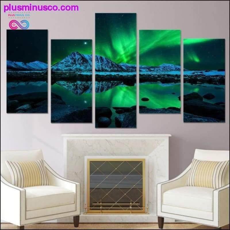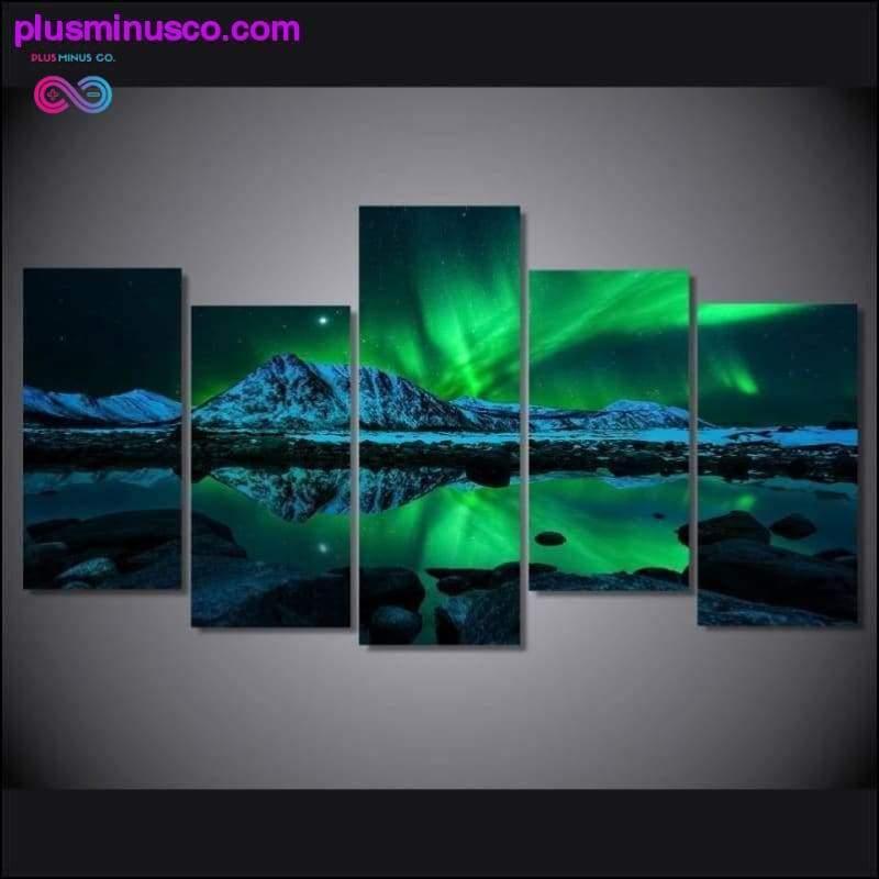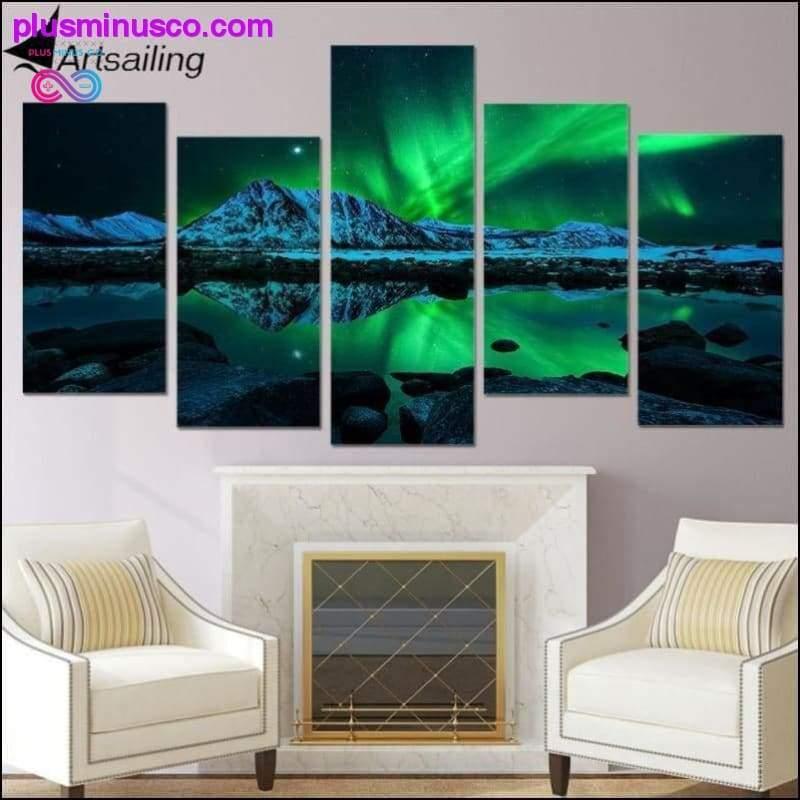 HD Print landscape painting 5 piece canvas art green Aurora borealis lake wall picture for living room Modular pictures